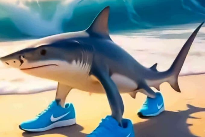 このミームの起源は、2025年1月に投稿された「スニーカーを履いたサメ」の動画だと言われています。動画内ではサメが海岸を歩きながら、