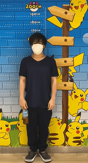 この画像では、ピカチュウの壁に貼られた身長メモリと比較すると、もこうさんの頭頂部が164〜165cm付近にあることが分かります。